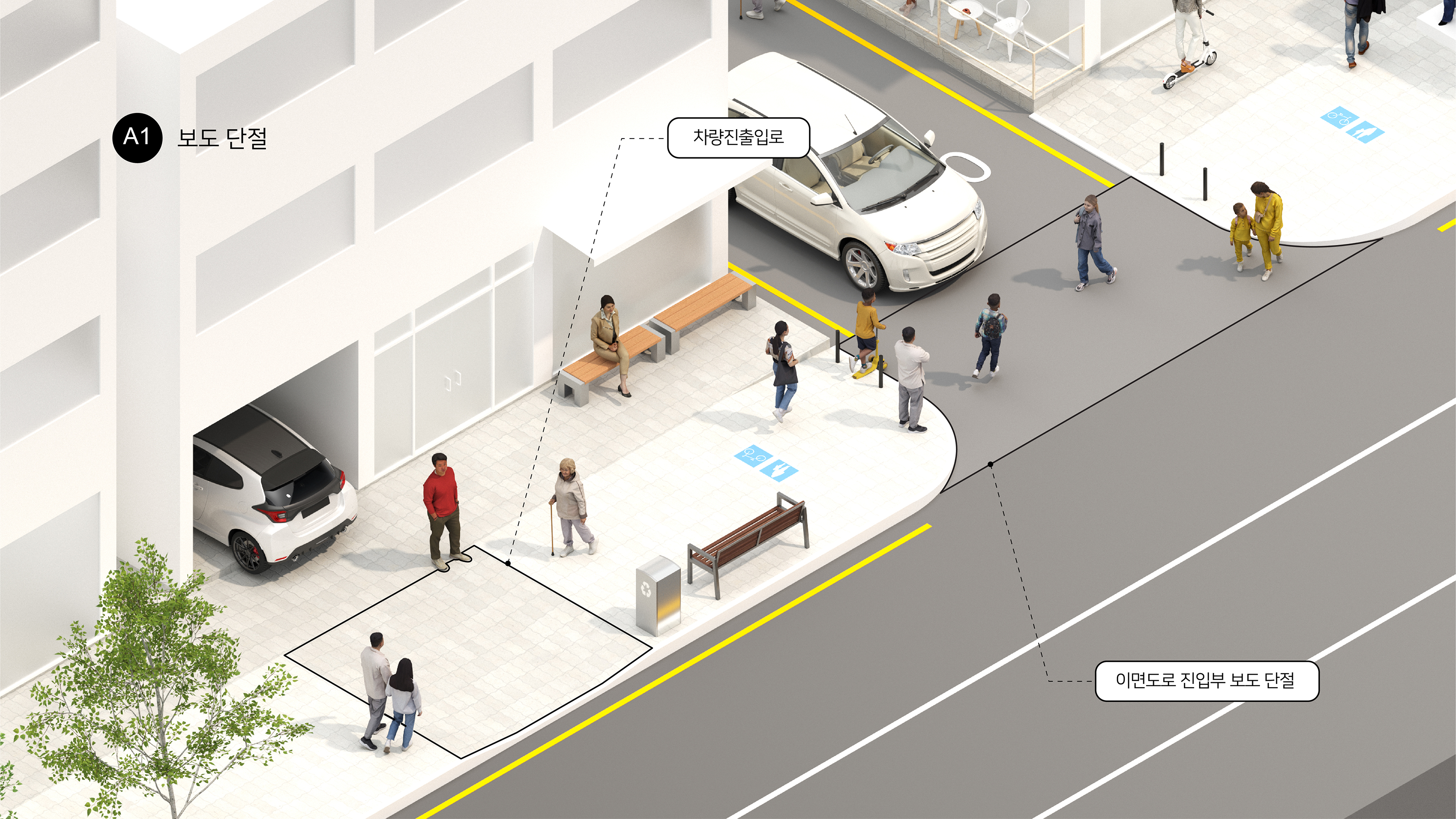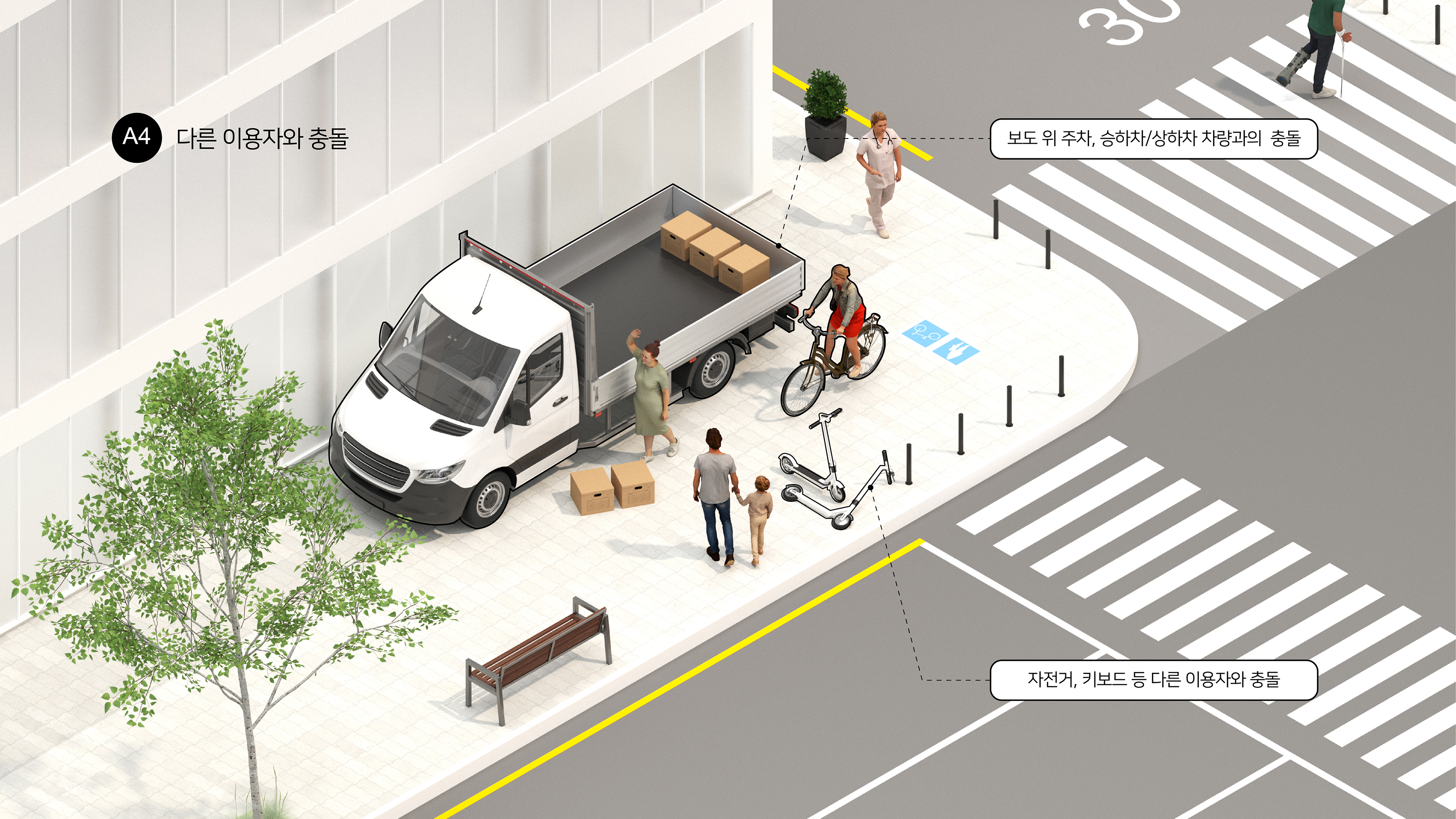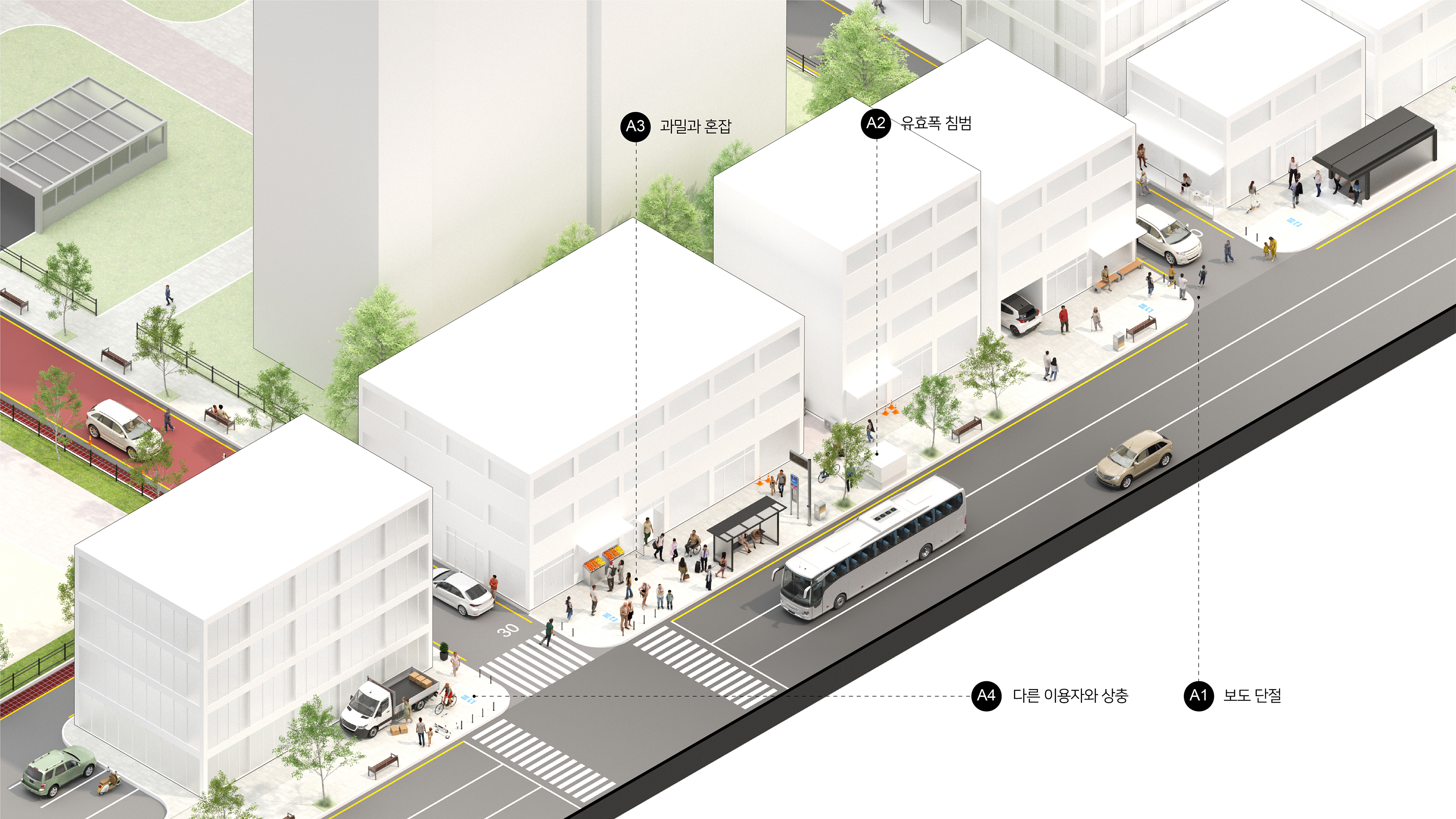 보차분리도로(A)는 도로와 보도가 물리적으로 분리되어 있으나, 차량 진·출입로 및 이면도로 진입부로 인한 보도의 단절(A1), 가로시설물 및 적치물, 보도 점용 행위와 공사로 인한 유효폭 침해(A2), 보행류 합류 지점(횡단보도·정류장 대기공간)에서의 과밀 및 혼잡(A3), 보도 위 주차·승하차 차량, 자전거·킥보드 등 다른 이용자와의 충돌(A4)이 발생할 수 있다