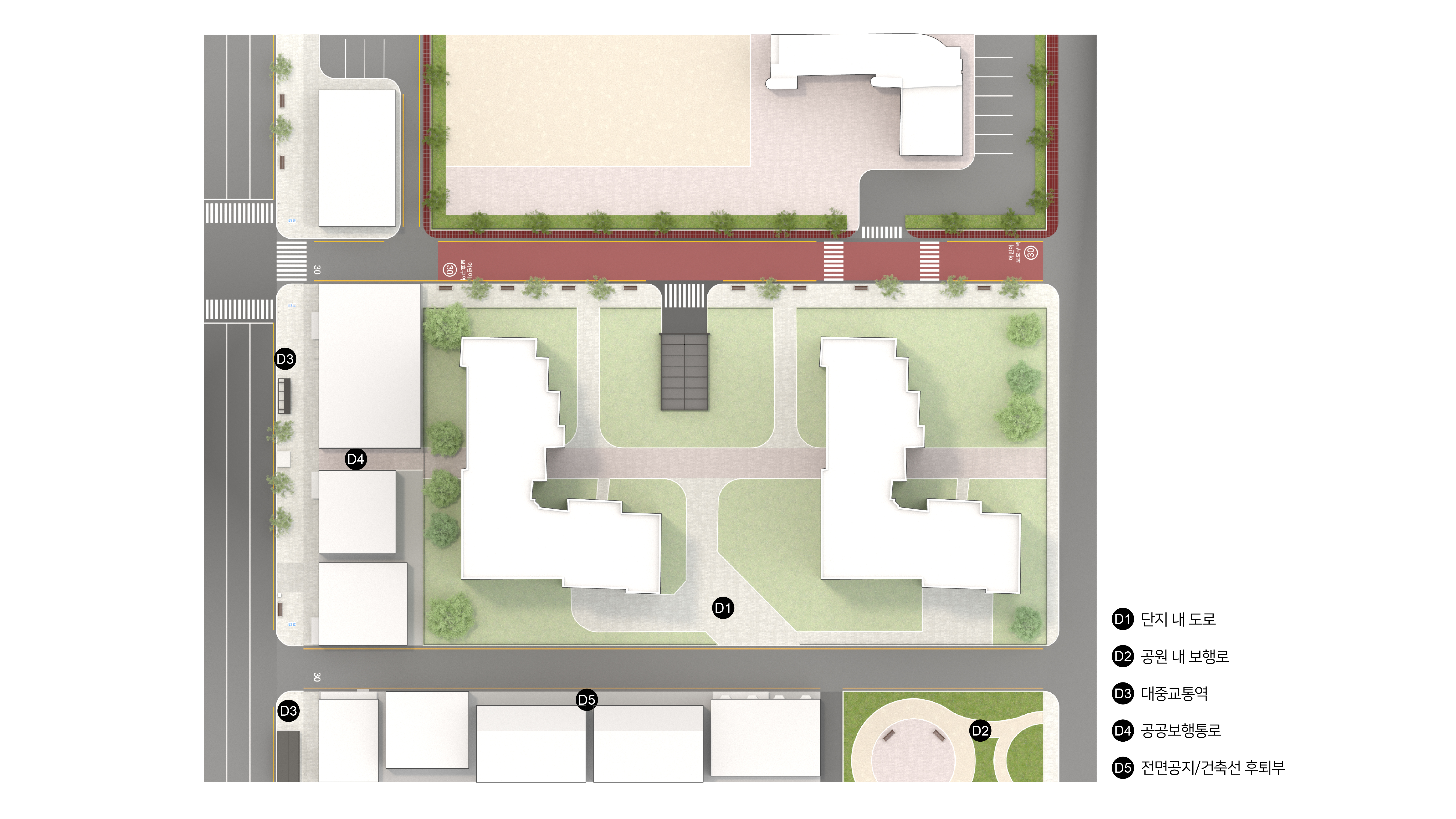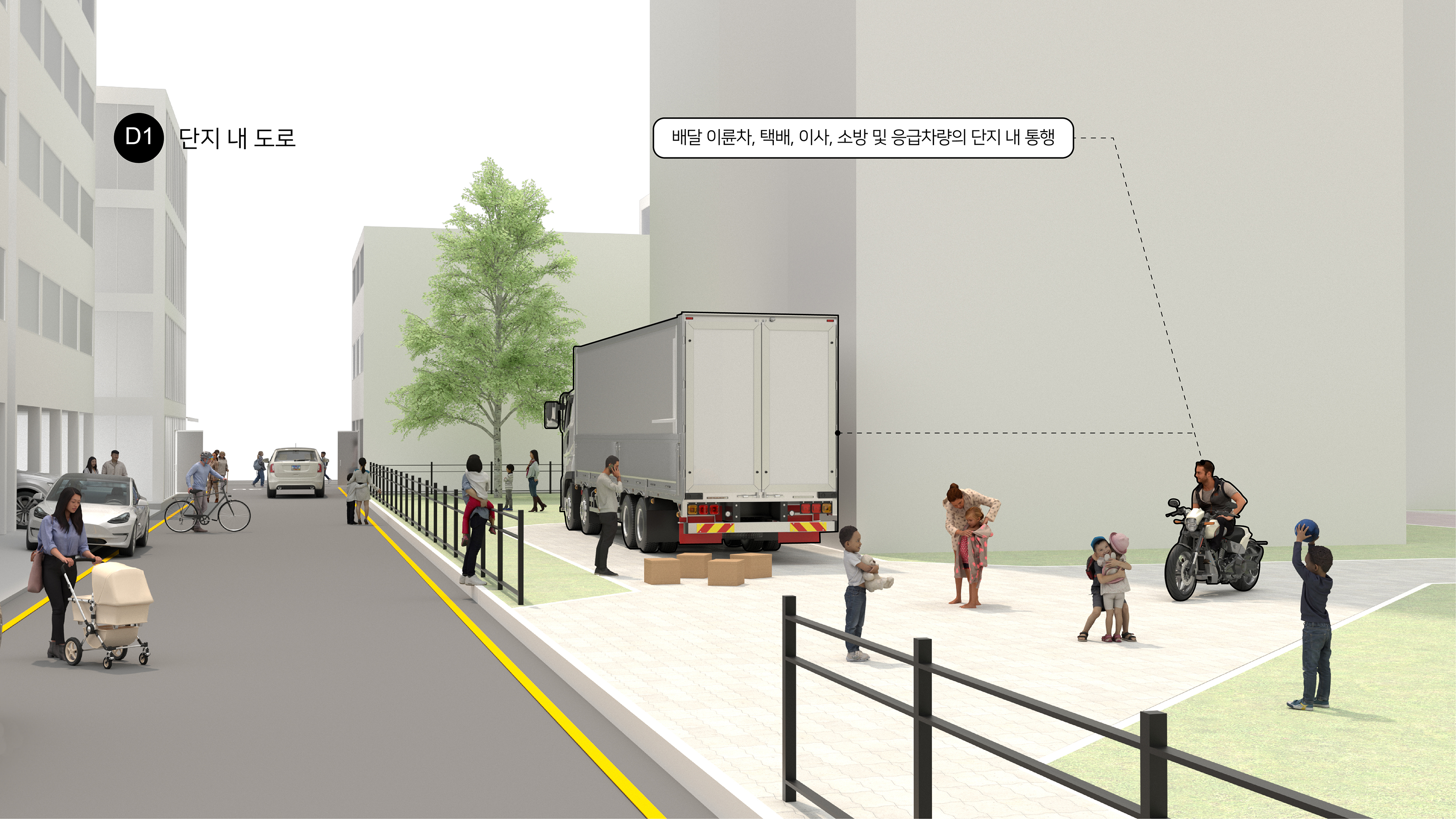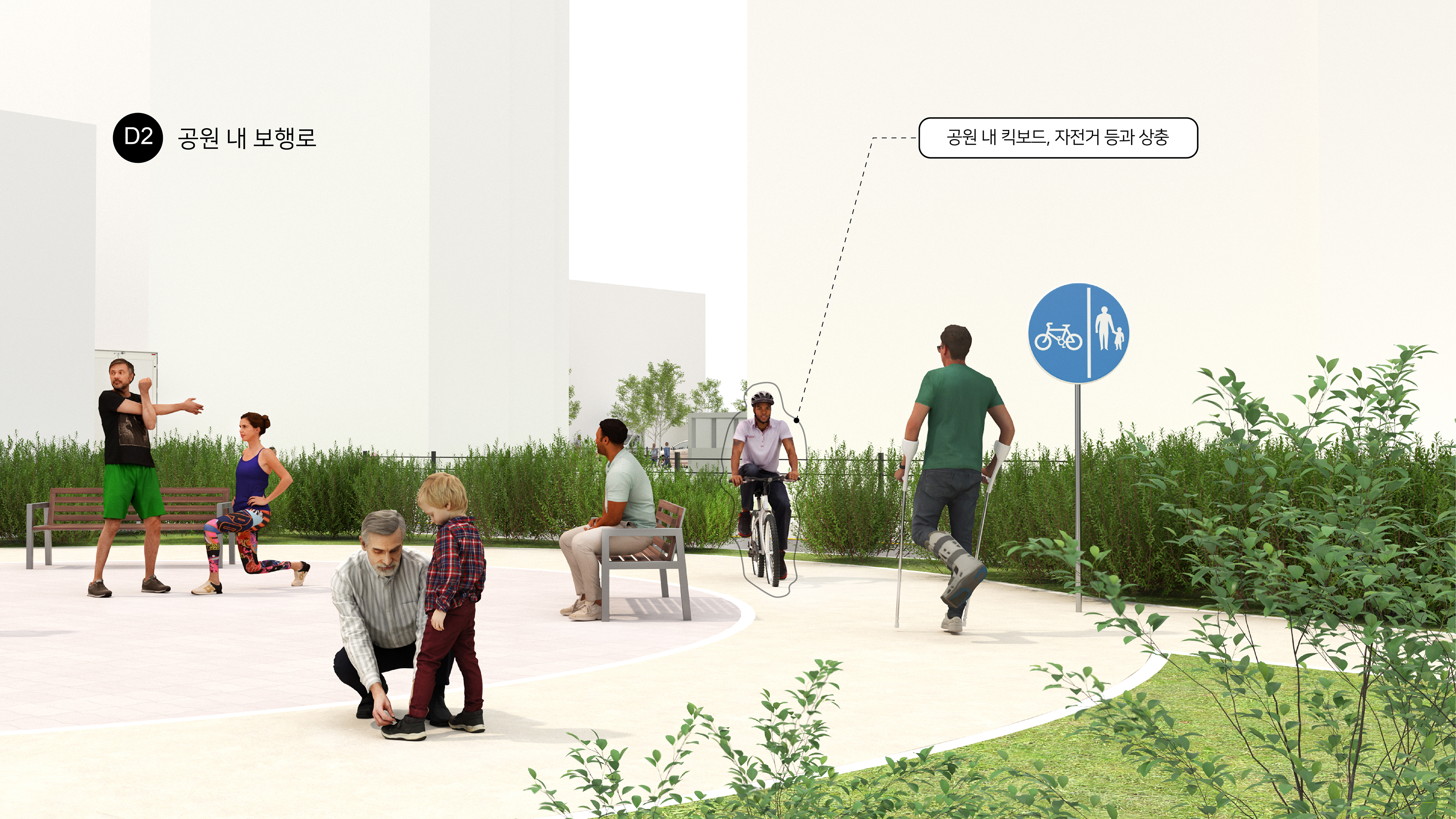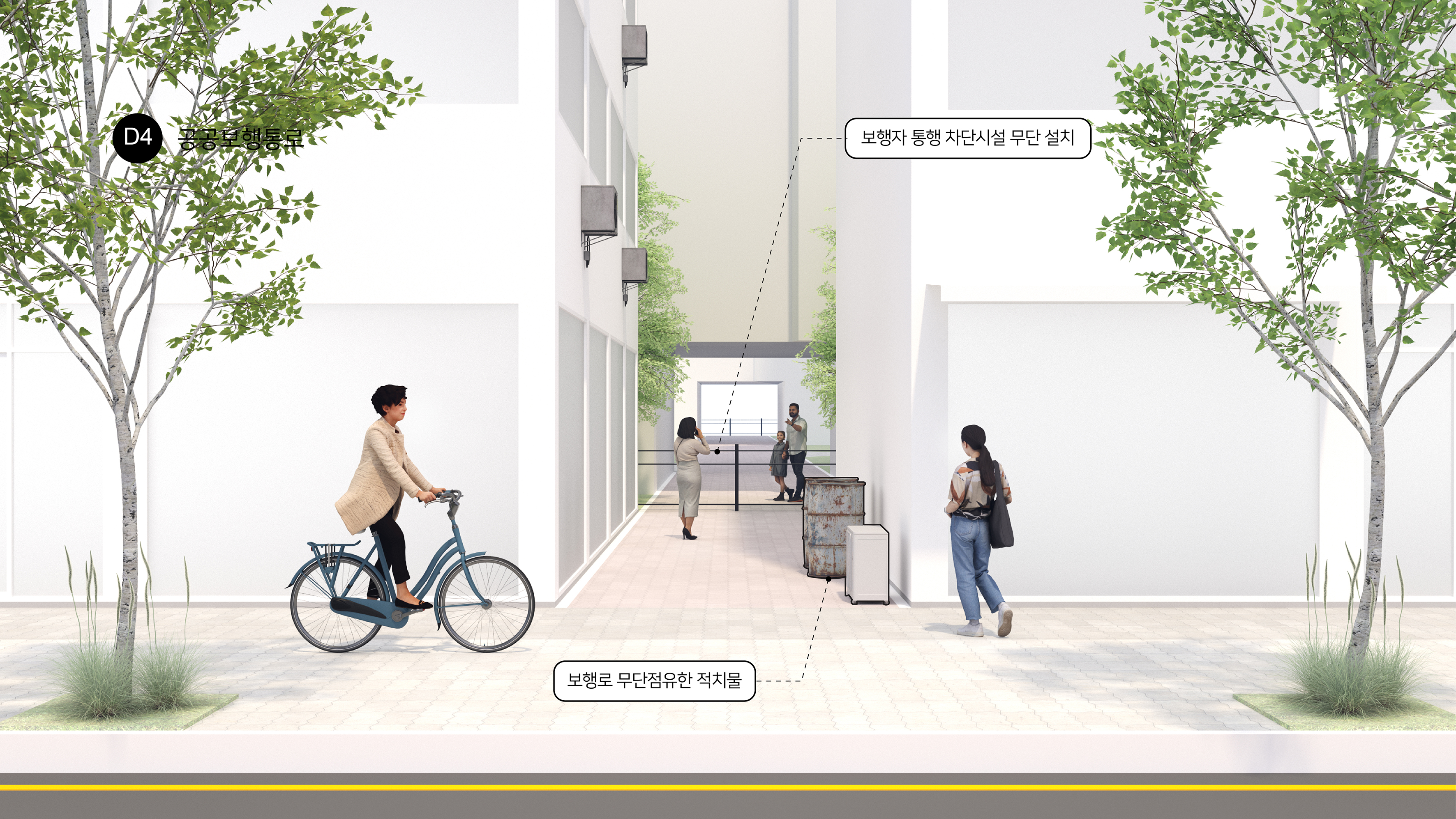 단지 내 도로(D1)에서는 배달 이륜차, 택배·이사 차량, 소방 및 응급차량의 통행으로 인해 보행 안전성이 저해되는 문제가 발생하고 있다. 공원 내 보행로(D2)에서는 킥보드와 자전거의 통과로 보행자와의 상충이 빈번하게 나타나며, 대중교통역 주변(D3)에서는 지하철 출입구 인근의 혼잡으로 인해 유효 보도 폭이 침범되는 문제가 발생한다. 또한 공공보행통로(D4)에서는 통행 차단시설과 적치물의 무단 점유로 인해 보행 연결성이 지속적으로 저해되고 있다.