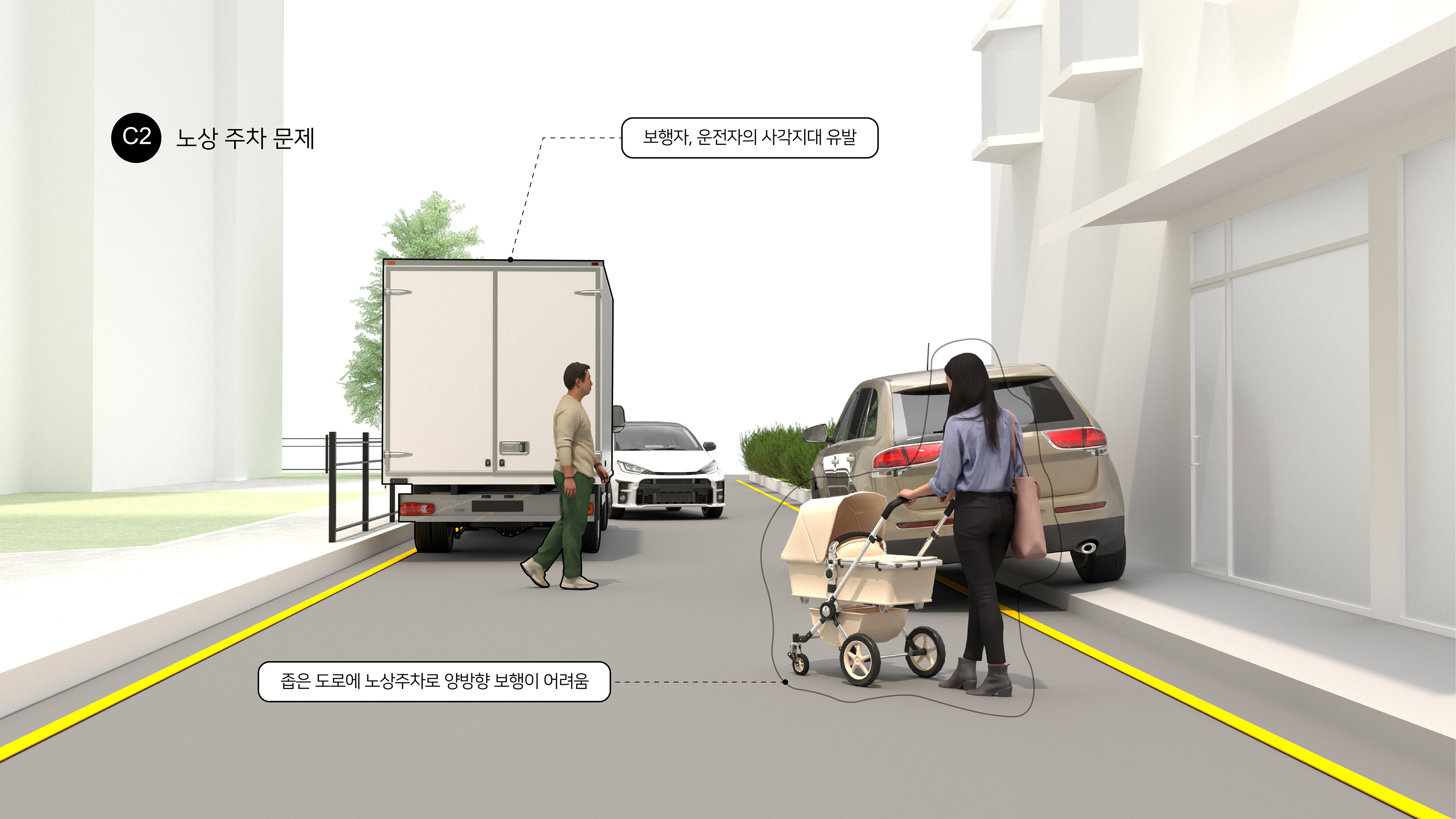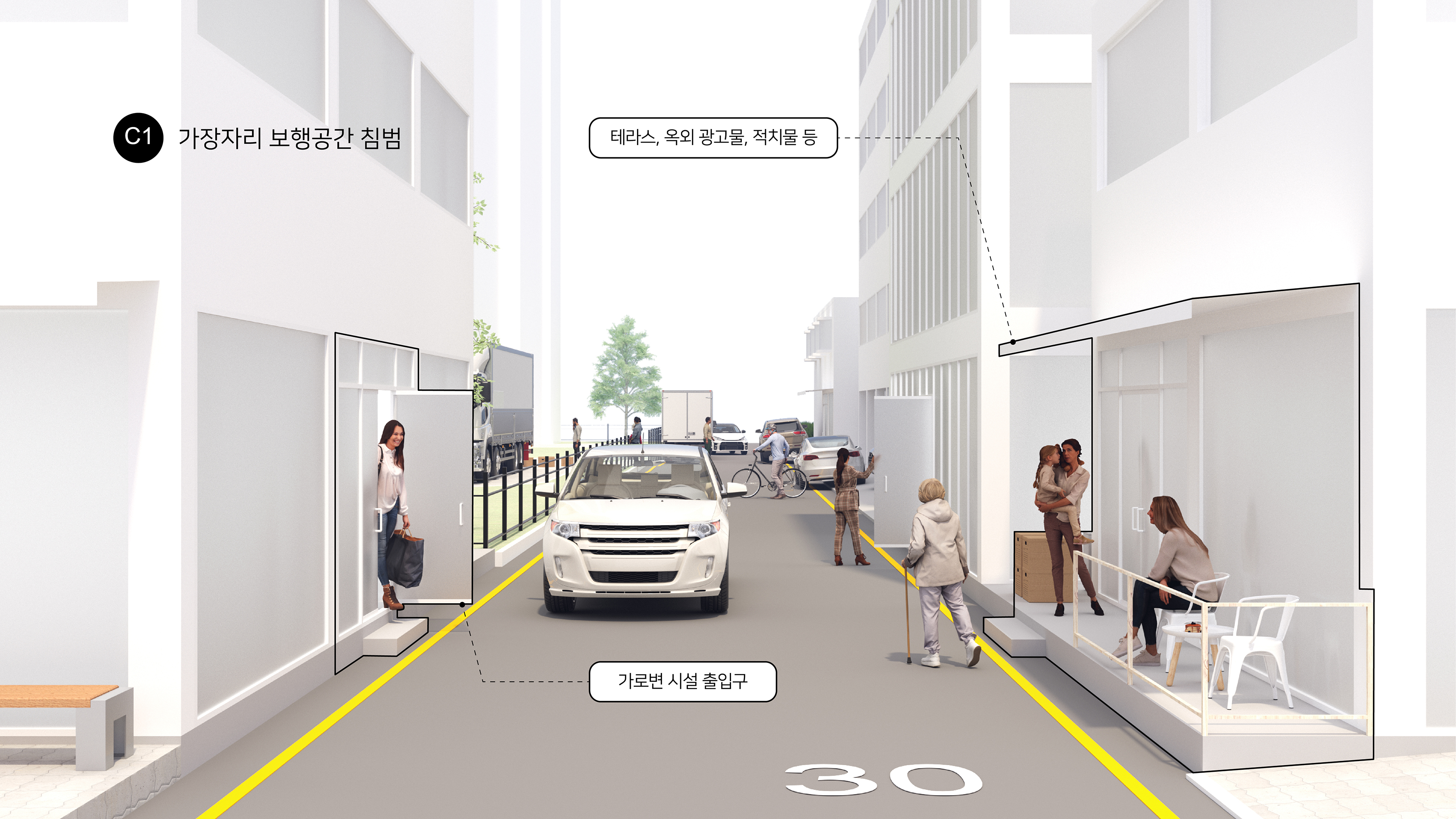 보차미분리도로(C)는 도로와 보도가 분리되지 않은 도로 유형으로, 가로변 시설 출입구, 테라스, 옥외 광고물 등으로 인해 가장자리 보행공간이 침범되거나(C1), 노상주차(C2)로 다른 운전자와의 사각지대가 발생해 보행 안전과 이동에 어려움이 나타날 수 있다.