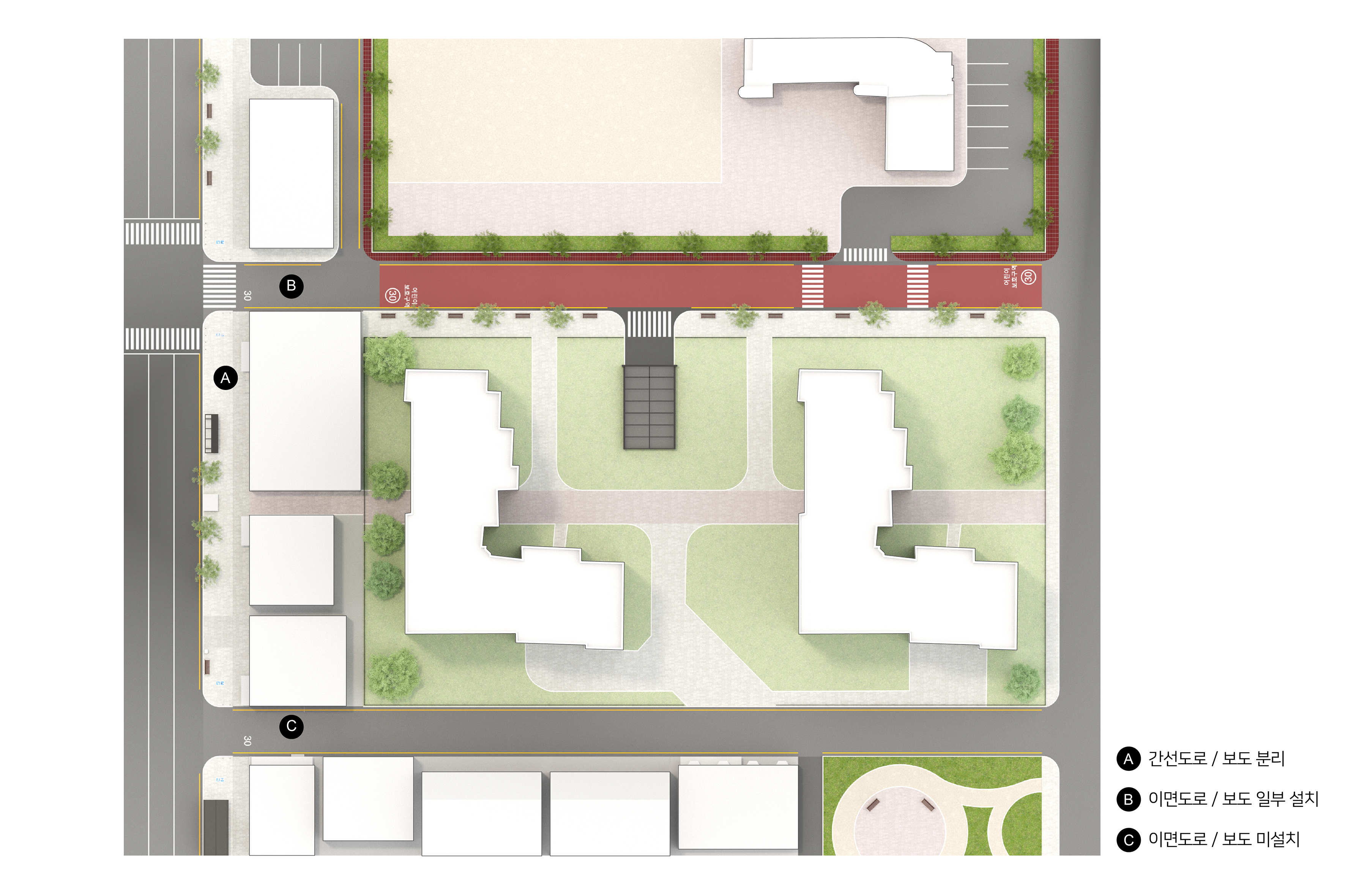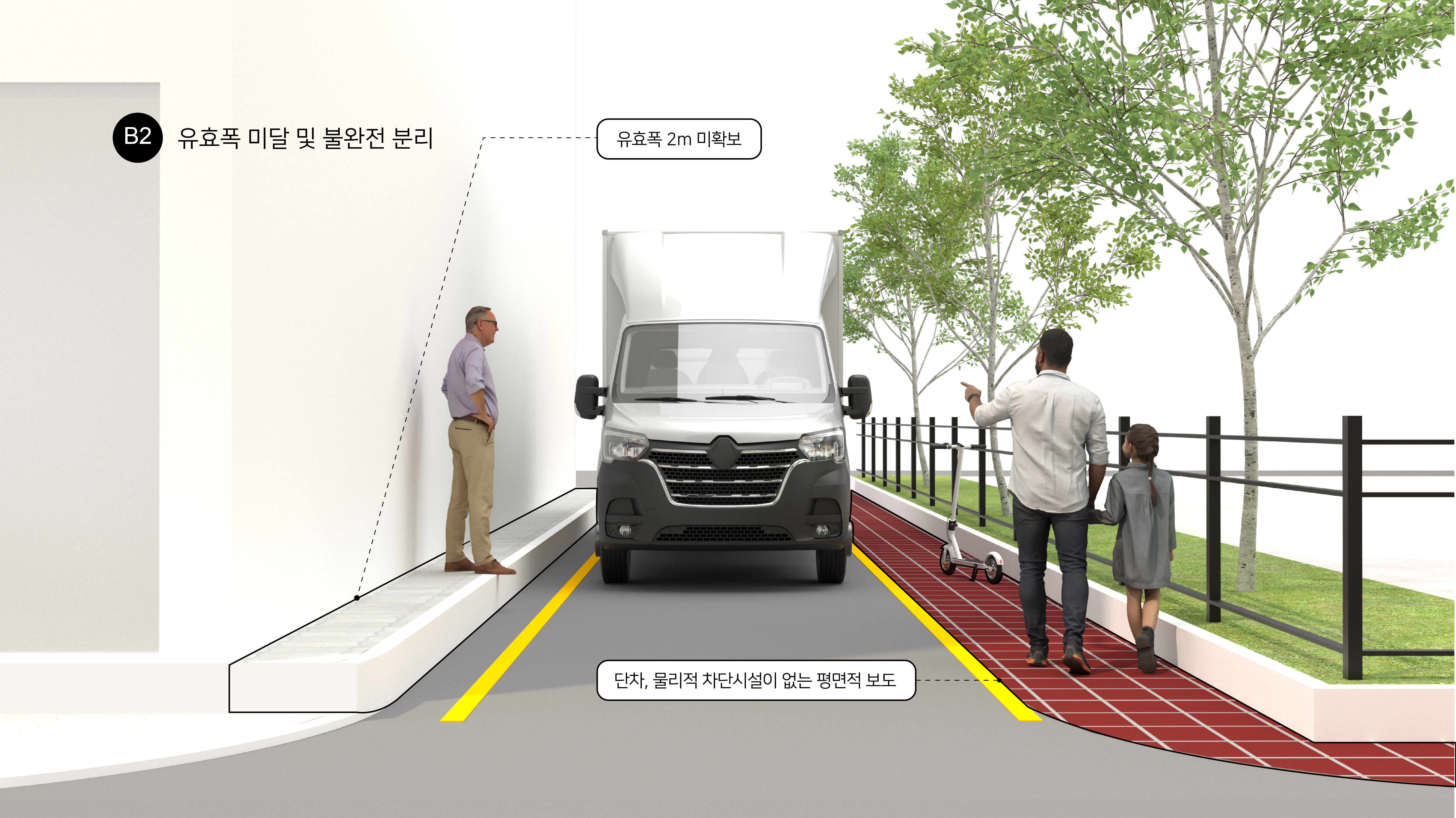불완전분리도로(B)는 도로와 보도가 물리적으로 분리되어 있으나, 보행로가 편측으로 설치되어 있거나(B1) 보행로 폭이 협소해 유효폭이 미달되는 경우로(B2), 보행 안전성과 연속성이 충분히 확보되지 않은 도로 유형이다.