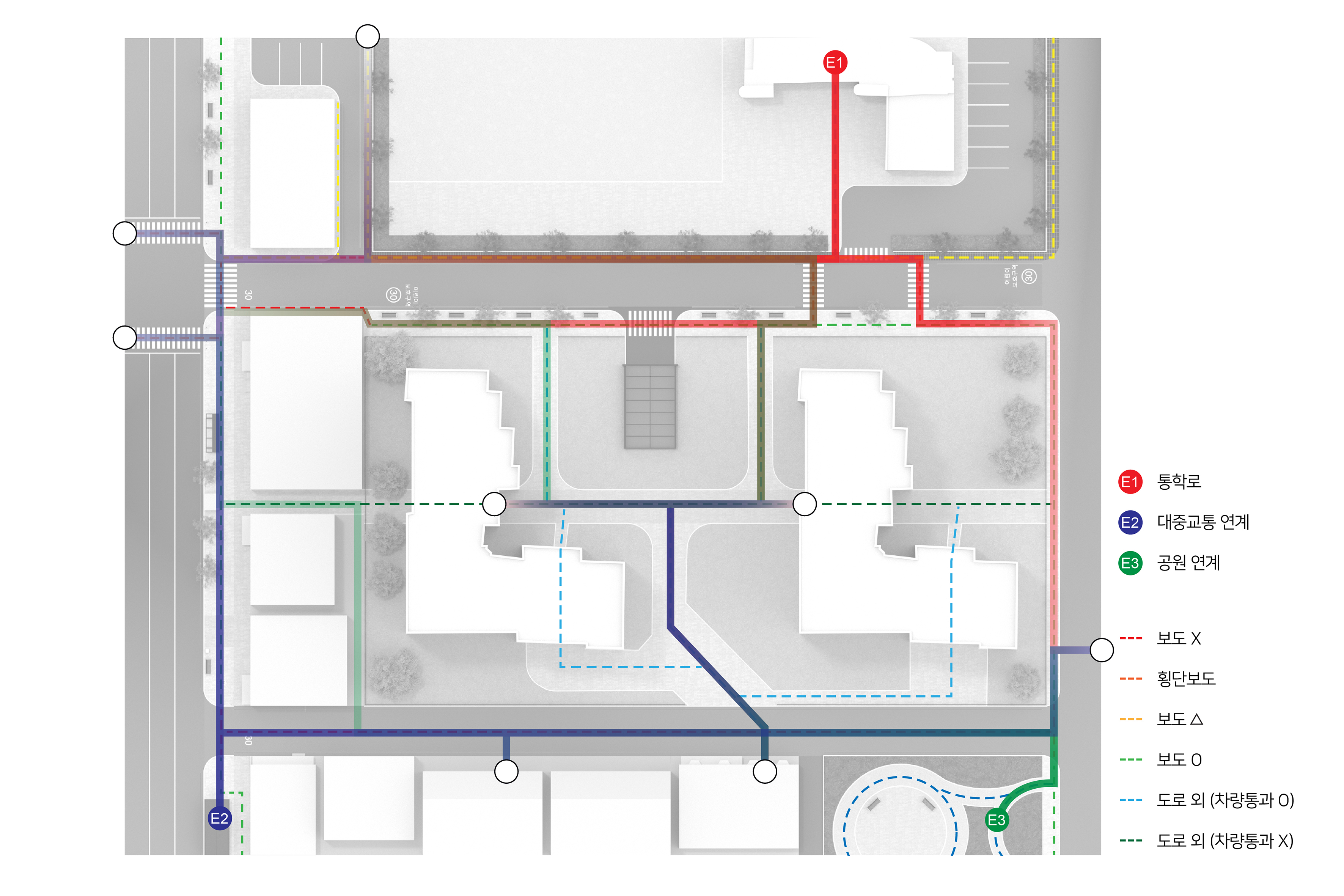 보행자길의 공간적 특성을 시각적으로 검토하기 위해, 본 연구에서는 대로와 이면도로를 아우르는 가상의 보행환경을 설정하였다. 보행자길을 독립적인 시설이 아닌 주변 공간과 유기적으로 연결된 연속적인 네트워크로 간주하고, 구역 내에 학교·공원·대중교통시설·주거 및 상업시설 등을 배치함으로써 다양한 시설과 보행로가 복합적으로 연결된 실제적인 보행환경을 구현하였다.
